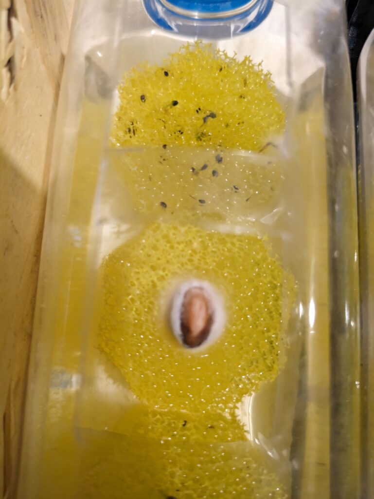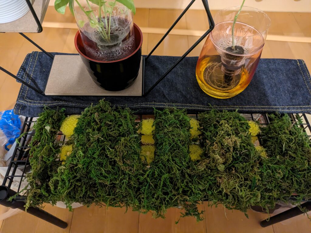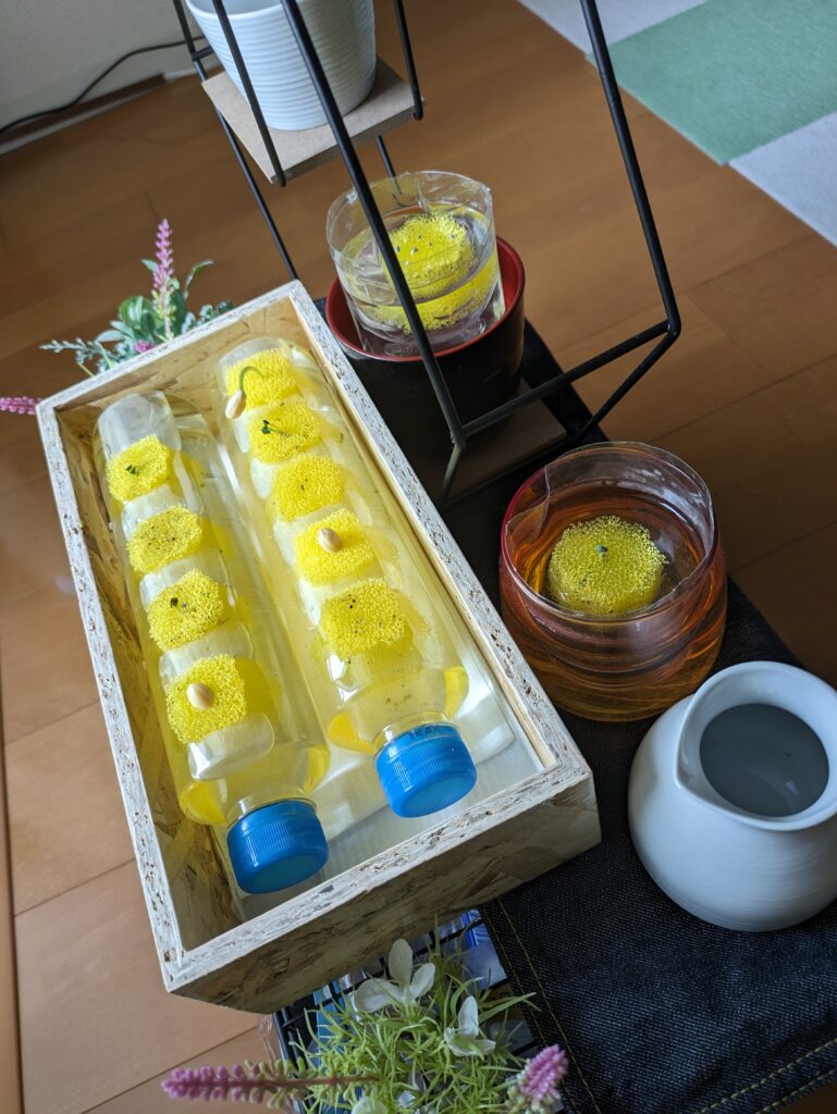 スポンジに水をしみこませ、ペットボトル内に並べる。成長は格段に早かった。