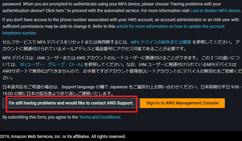 「ステップ2:電話番号の確認」が失敗すると、「AWSサポートにお問い合わせください」と対応ページの提案を受けます。